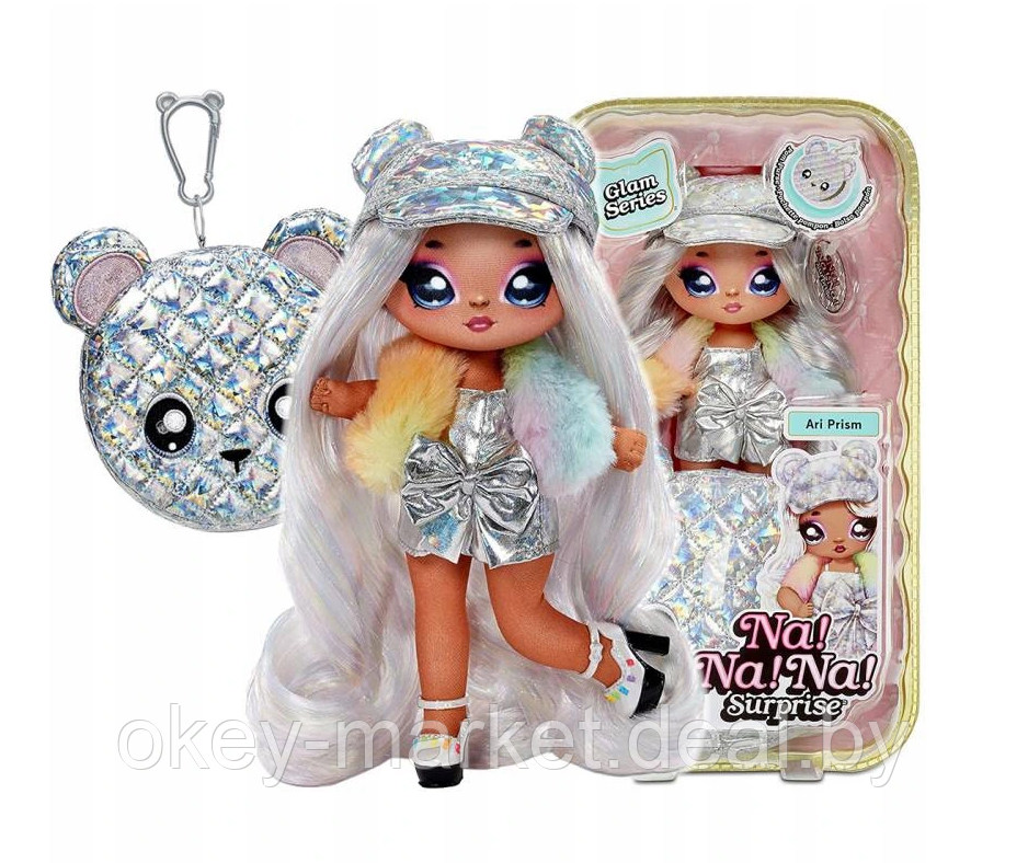 Мягкая кукла-сюрприз Na! Na! Na! Surprise серия Glam Ari Prism мишка. Мягкая кукла Na Na Na Surprise серии Glam от MGA станет отличным подарком для девочки на любой праздник, будь то Новый год, день рождения или Рождество. Эта очаровательная кукла обладает мягкими прошитыми волосами, которые можно расчесывать, и лицом, напечатанным на ткани, что придает ей особое очарование. Подвижные руки, ноги и голова позволяют кукле принимать различные позы, делая игру с ней еще увлекательнее. В комплекте с куклой высотой 19 см идет стильный кошелек на клипсе размером 12х12 см, который станет прекрасным аксессуаром. Эта кукла обязательно порадует любую девочку и станет ярким дополнением к ее коллекции, привнося в ее игры радость и волшебство.