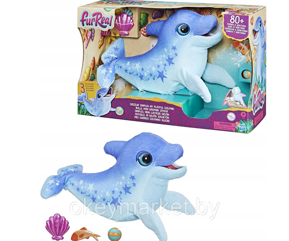 Игрушка Фурриал Френдс Дельфин Долли Furreal Friends F2401.Очаровательный дельфин от FurReal станет лучшим другом для вашего малыша. Эта интерактивная игрушка может продемонстрировать более 80 звуков и реакций! Ребенок с удовольствием будет ухаживать за своим питомцем, кормить его вкусной рыбкой и чистить его мягкие бока щеткой.Он может двигать хвостом, ластами, ртом, издавать шум волн, отбивать мячик и многое другое. Еще он реагирует на прикосновения, имитирует плавательные движения и подарит море удовольствия во время игры! Ребенок с удовольствием будет ухаживать за своим питомцем Dazzlin' Dimples My Playful Dolphin, кормить его вкусной рыбкой и чистить его мягкие бока щеткой. Игрушка также можете перейти в ночной режим и убаюкает ребенка размеренным шумом волн.