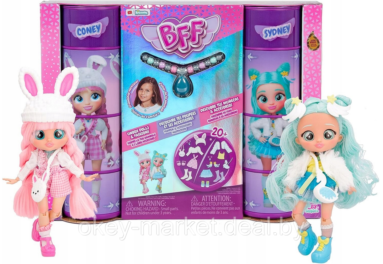 Откройте для себя два пакета BFF от Cry Babies с куколками Кони и Сидни! Теперь вы можете иметь 2 из ваших любимых персонажей BFF! В комплект входят куклы Кони и Сидни, которые восхищают модным нарядом и длинными цветными волосами, стеклянными глазами и движущимися частями тела.